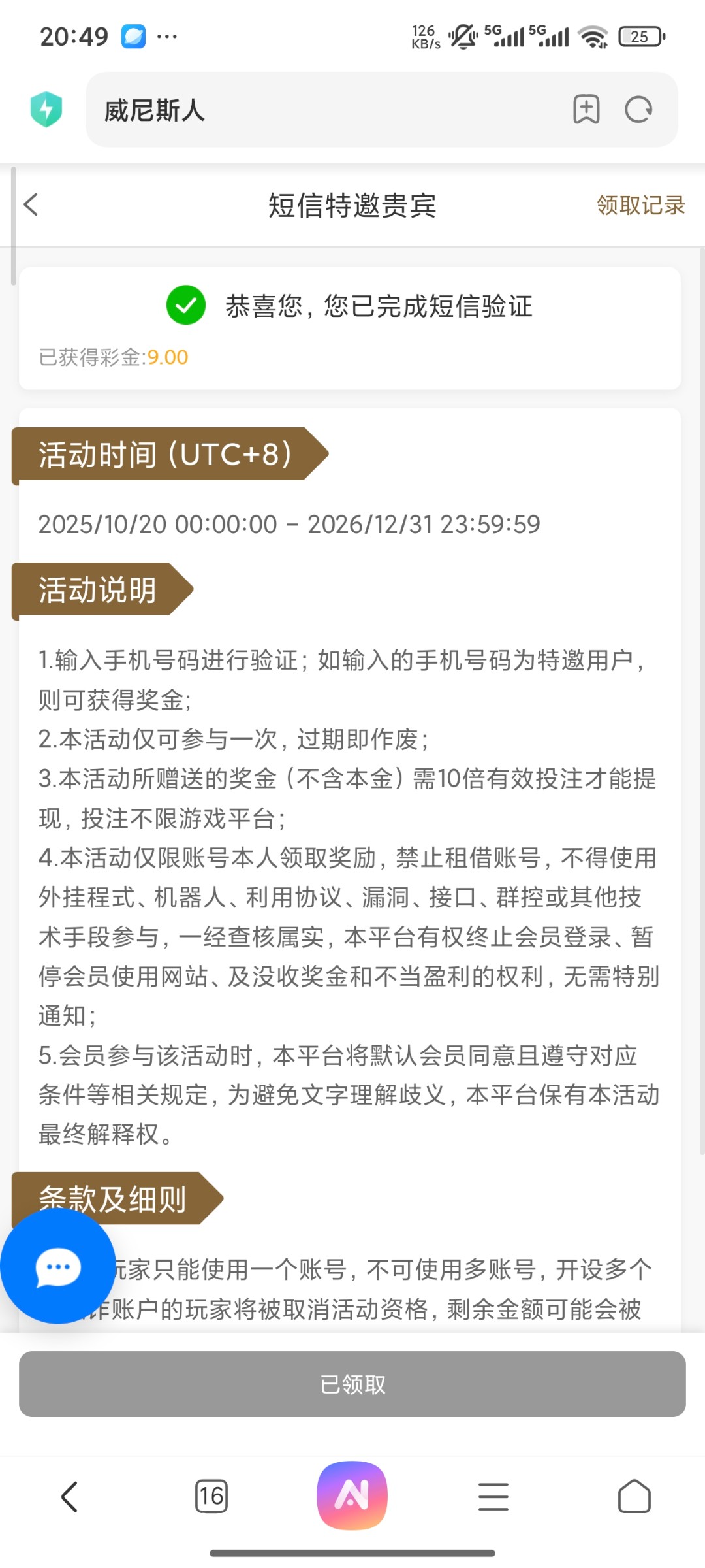 领是领到了,但杀的很,摇六毛麻将15把就中一次奖,中了3毛,其他全空