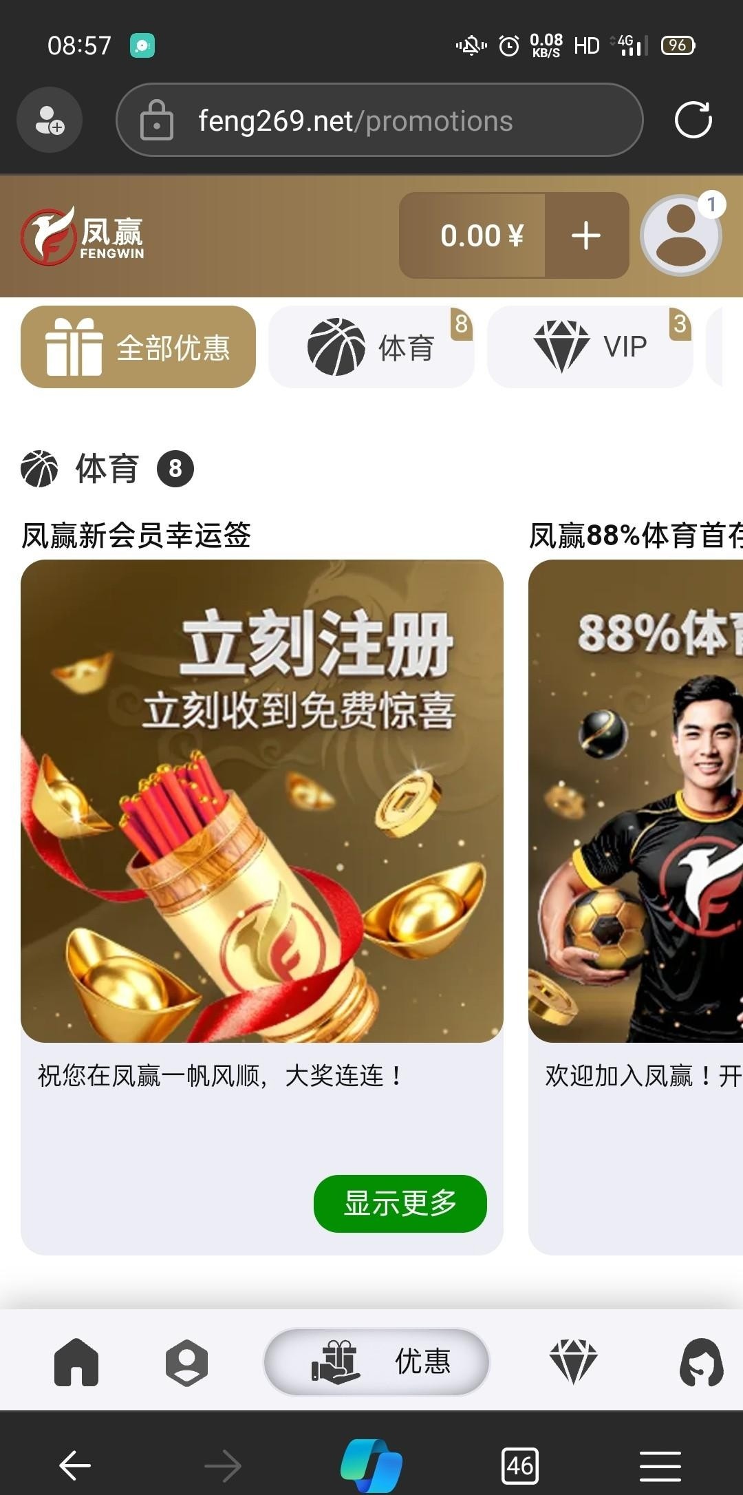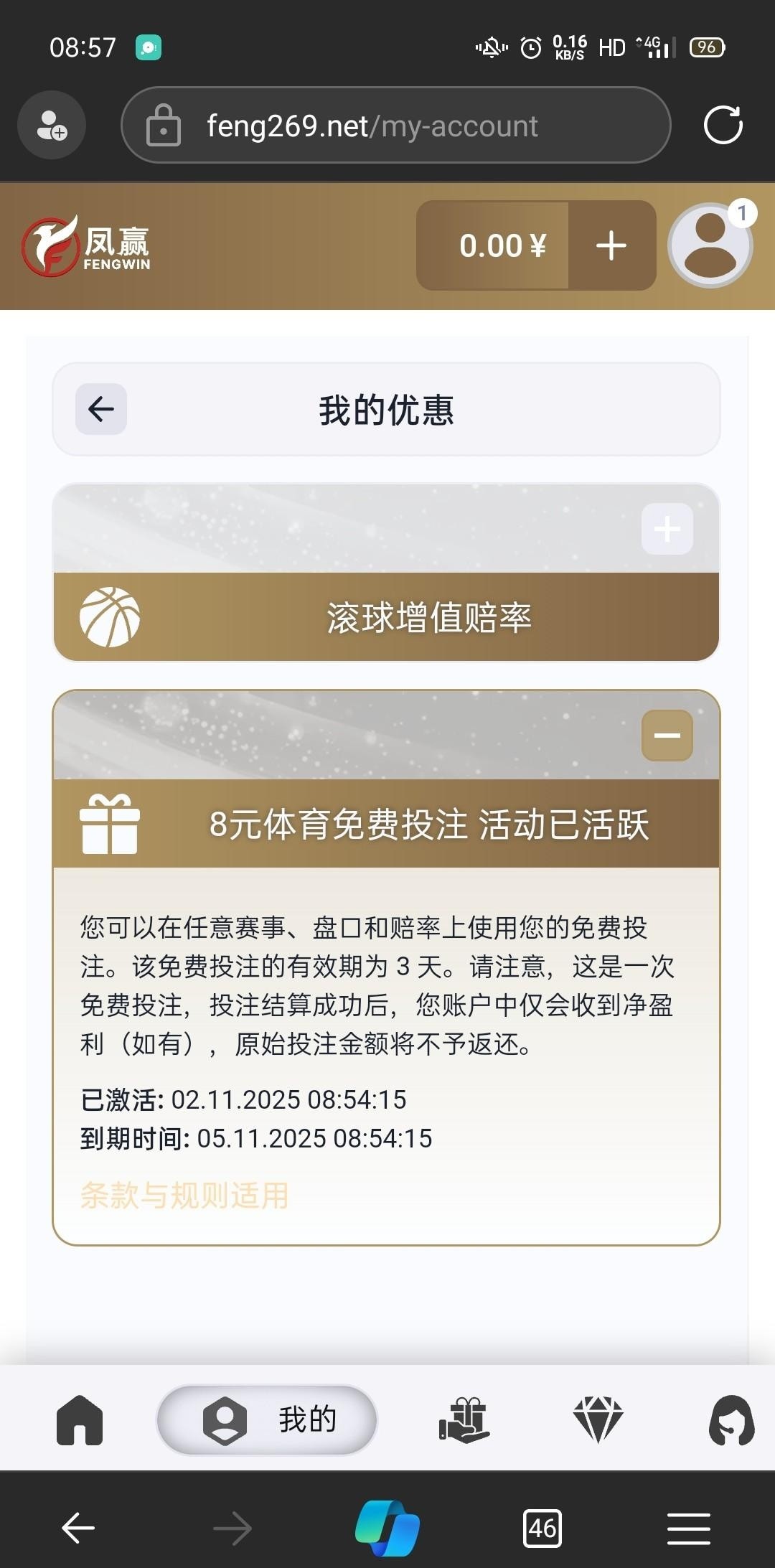 注册自动在个人中心,优惠活动抽取免费彩金。我抽到8块体育彩金。还没玩,出款自测。网址http://fengluck.com/