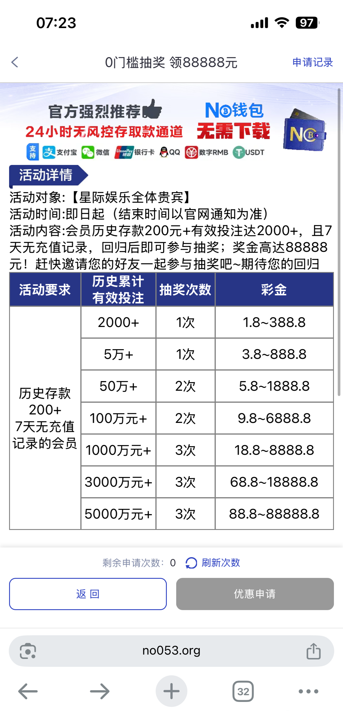 我老号充值过v3,一年没充值了,申请打码2000+安排了3.8,回归活动4自助申请网址:053.am